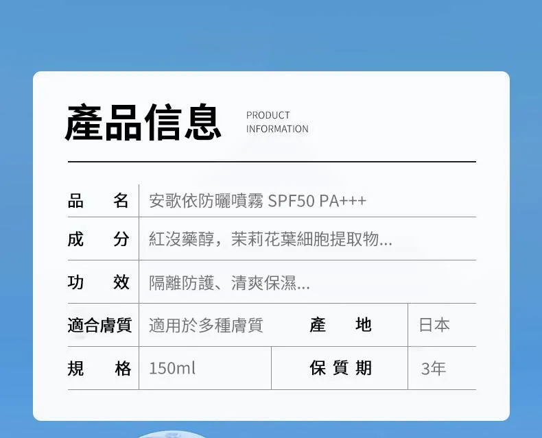 7分鐘前安歌依光圈防曬噴霧,細密噴頭設計 噴頭360°可旋轉自然膚惑,隔離防曬一瓶搞定 - 僅此一天「安歌依光圈防曬噴霧」8入72%用戶的選擇!NT$1598【限時免運】